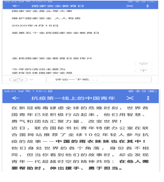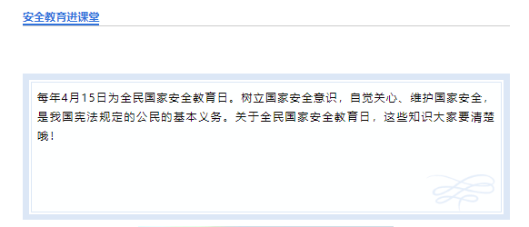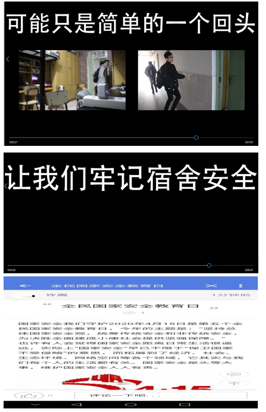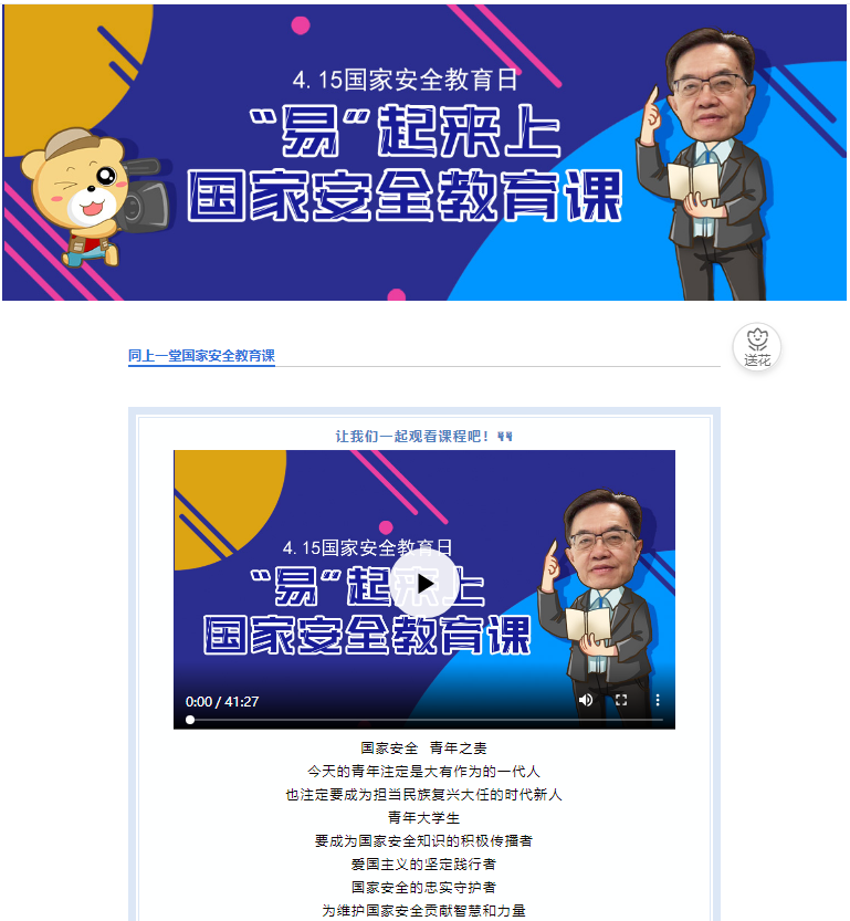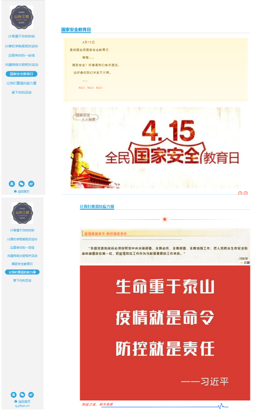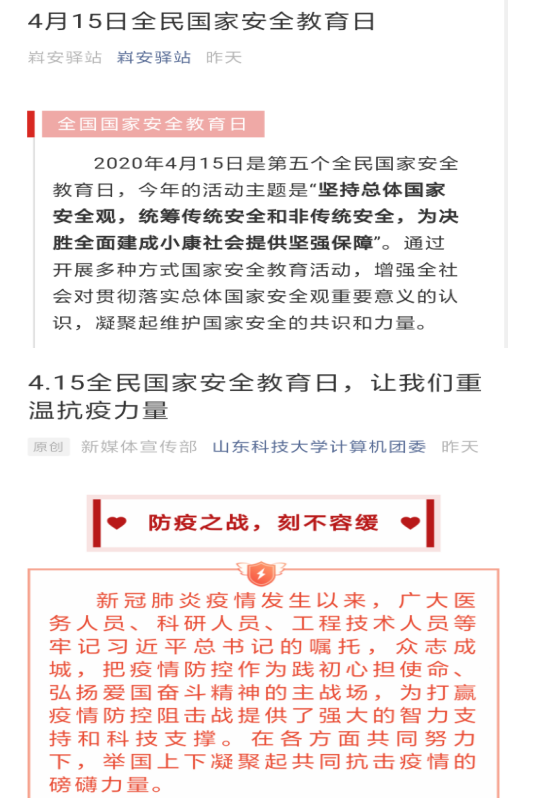 为迎接全民国家安全教育日,学院师生利用中国大学生在线、易班等在线教育平台,深入学习“同上一堂国家安全教育课”,加强全民国家安全教育,推动总体国家安全观深入人心。学院深入开展大学生安全知识学习答题活动,组织开展“深入认识公共卫生安全,增强国家安全意识”主题“云”班会、在线团日活动等各类活动,加强学生对国家安全与公民切实利益关系的认知,提高其维护国家安全的法律意识、责任意识和行动自觉。学院加大国家安全教育宣传力度,通过微信公众号、易班平台、宣传栏等方式加大推送宣传力度,并在学院大屏幕滚动播放4.15全民国家安全教育日海报,从国家安全、人民安全、政治安全、生物安全、全面小康、公共卫生等方面开展宣传,进一步增强全民国家安全意识,凝聚形成维护国家安全的强大合力。